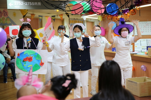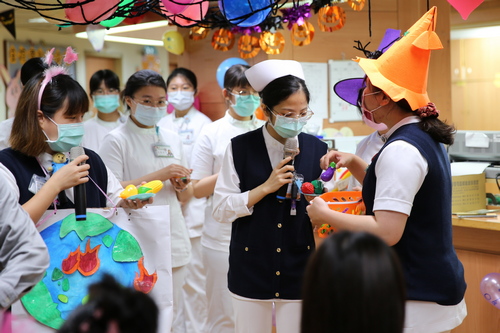 西洋萬聖節前夕,花蓮慈濟醫院兒科病房團隊在10月28日,舉辦「健康蔬食,我最愛」活動,帶著病房裡的家長及孩童,跳脫耳熟能詳「不給糖就搗蛋」的應景語,以「不吃糖才健康」向現場大小朋友呼籲外,團隊也以話劇、帶動唱、遊戲等方式,活潑介紹多吃蔬菜不僅能維護身體健康還能救地球,讓住院中的孩子們開心歡度不一樣的萬聖節。
