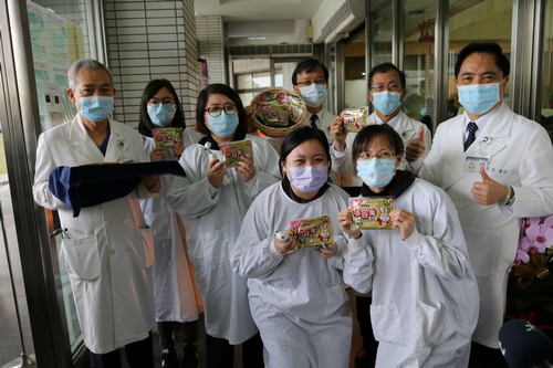 圖說:林欣榮院長與王志鴻、吳彬安副院長、醫務秘書李毅為醫院出入口管制防疫同仁送上暖暖包。