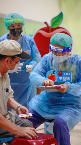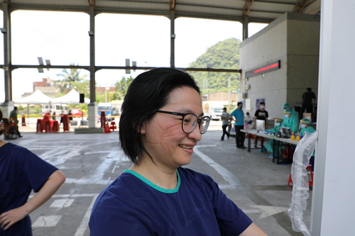 賴佩芳醫師也帶動團隊積極參與社區篩檢,例如在秀林鄉發生疑似社區群聚時,首日配合花蓮縣衛生局的社區篩檢中,引導動線規劃,修正民眾篩檢時的位置,讓篩檢過程更精準順利,而炎熱的六月天,汗水濕透他們的工作服,N95口罩更在他們的臉上留下深深的印痕。