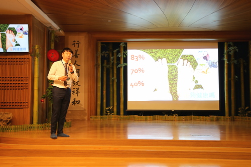 中圖:慈大物理治療學系碩士班蕭永政分享可攜式足底核心肌群訓練器及訓練方法。