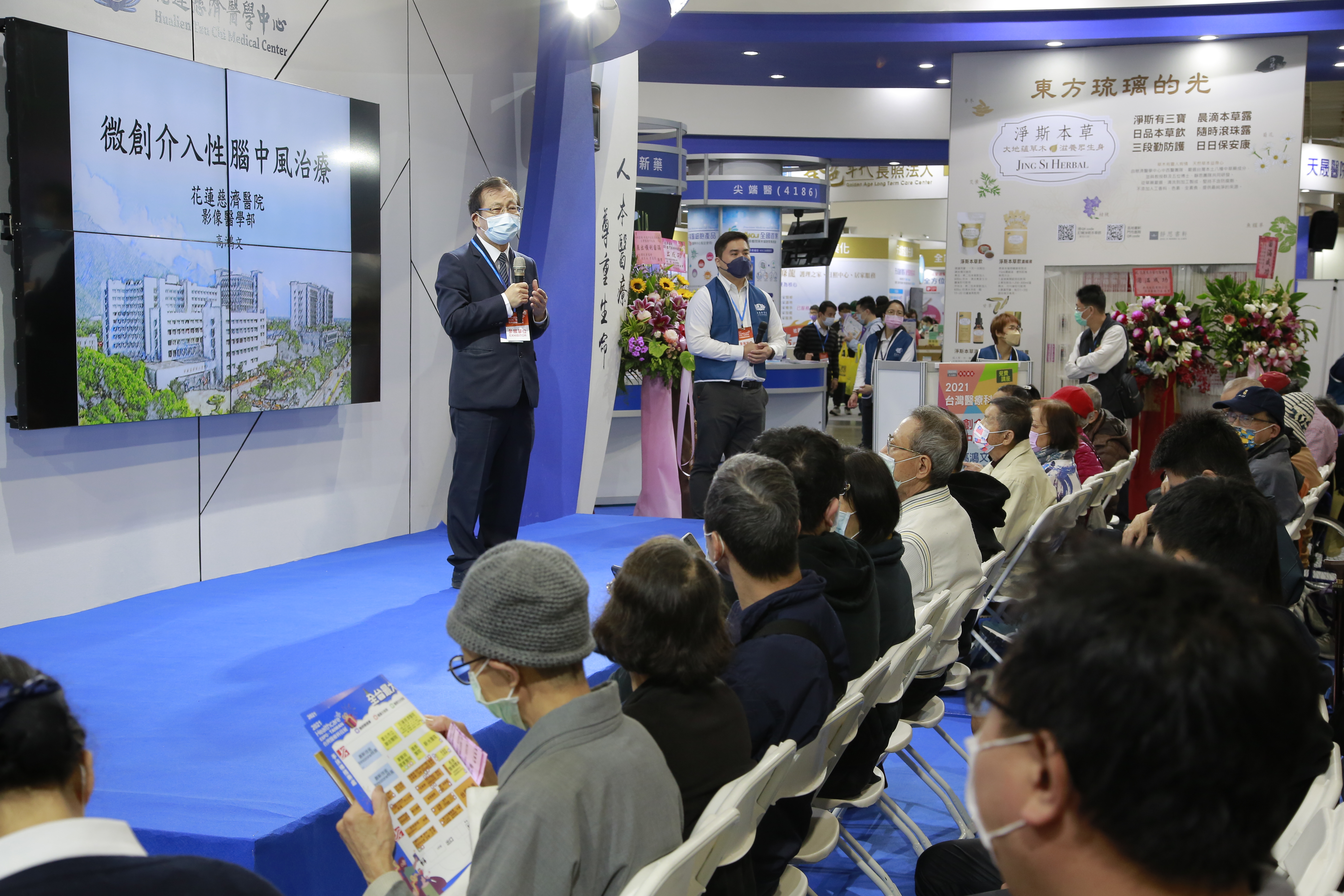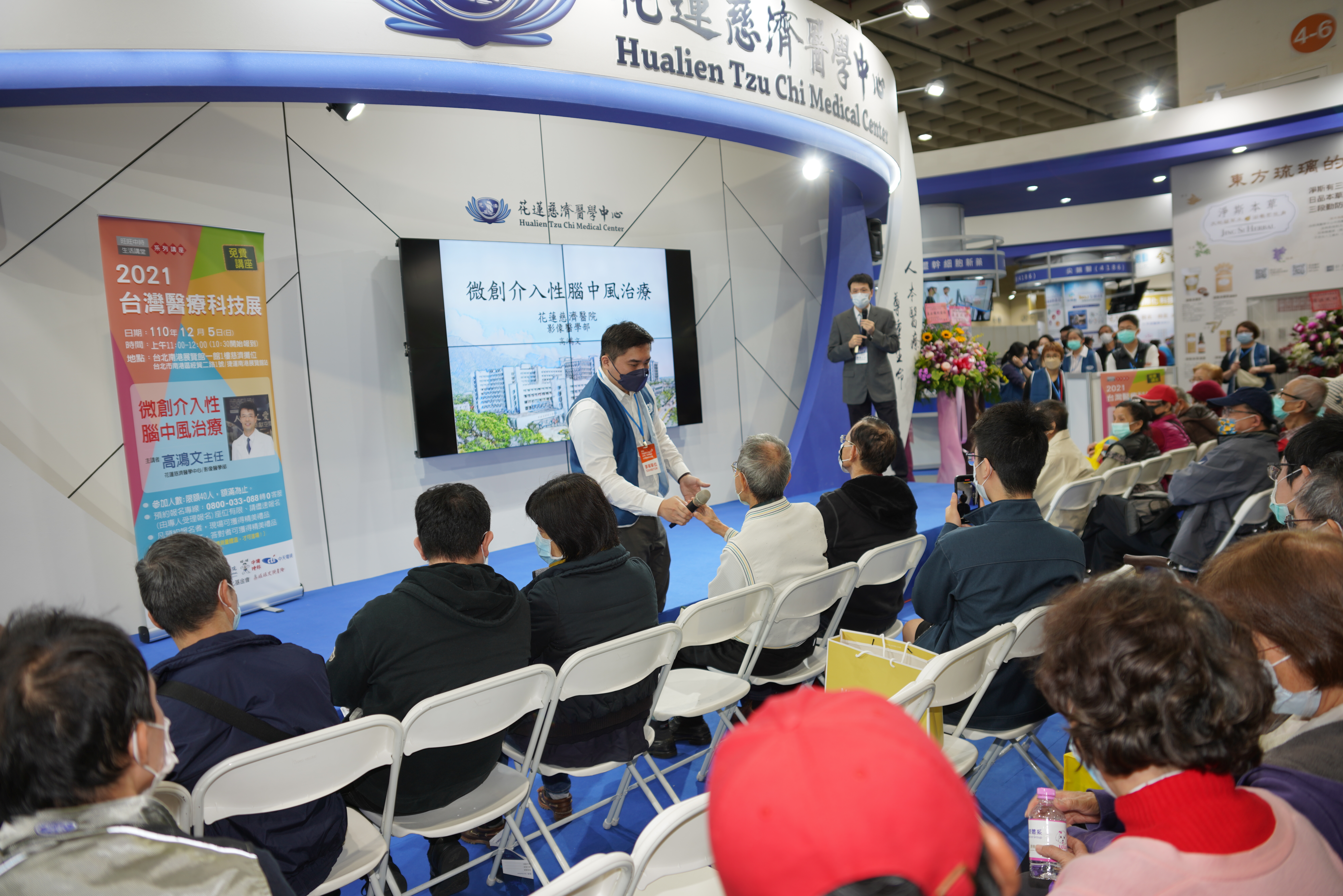 左圖:高鴻文主任在「2021台灣醫療科技展」中,以「微創介入性腦中風治療」為題在花蓮慈院攤位專家講座上分享,民眾踴躍提問。