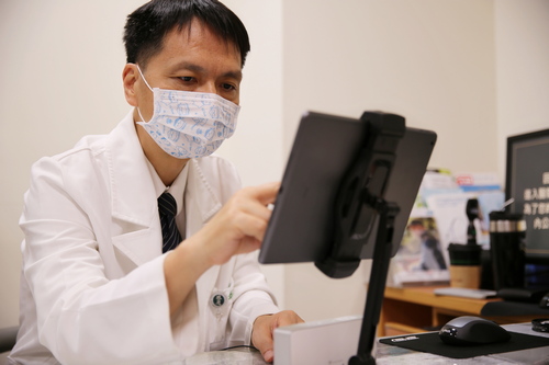 右圖:疫情期間,花蓮慈院家庭醫學科謝至鎠醫師(左),透過視訊為戴奶奶看診。