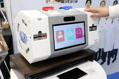 圖說:榮獲臨床新創獎的「模組化遠距健康照護系統-智慧藥箱」,由副院長許文林帶領護理部、癌症研究團隊與財團法人國家實驗研究院儀科中心合作開發的智慧藥箱。 智慧藥箱內建健保卡讀取與視訊模組,可插入健保卡或上方左右的ID手環,透過視訊確認病人,方可啟動藥箱。