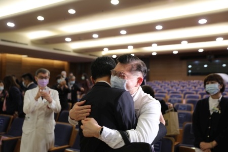 圖:朱頤的主治醫師黃威翰代表團隊為朱爸爸送上溫暖的擁抱,約定要一起完成朱頤號召十萬青年驗血建檔的遺願。