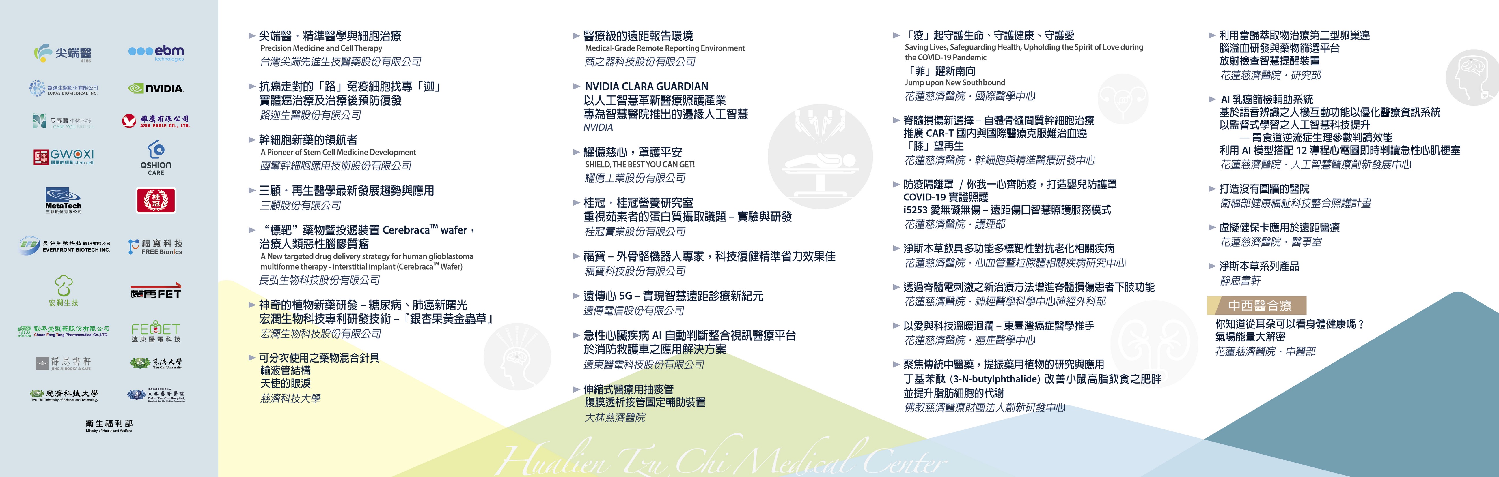 2021台灣醫療科技展十二月二日到五日在台北南港展覽館登場,花蓮慈濟醫學中心攤位在南港展覽館一館一樓的I830,合作參展的有尖端醫、路迦、長春藤、國璽、三顧、長弘、宏潤、勸奉堂等生技、製藥公司,商之器、NVIDIA、雄鷹、耀億、桂冠、福寶科技、遠傳電信、遠東醫電等健康照護、科技公司,以及大林慈濟醫院、慈濟大學、慈濟科技大學。