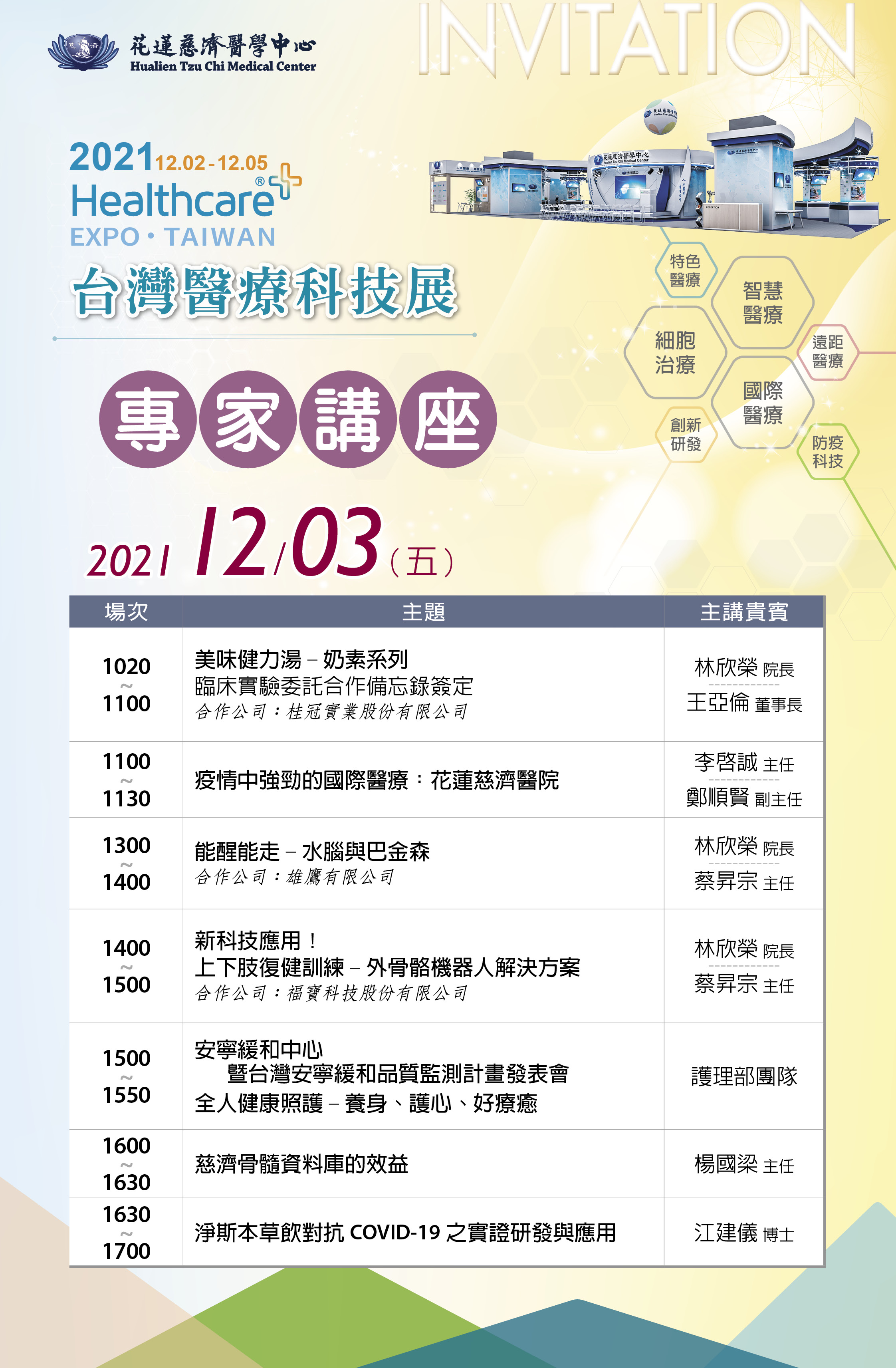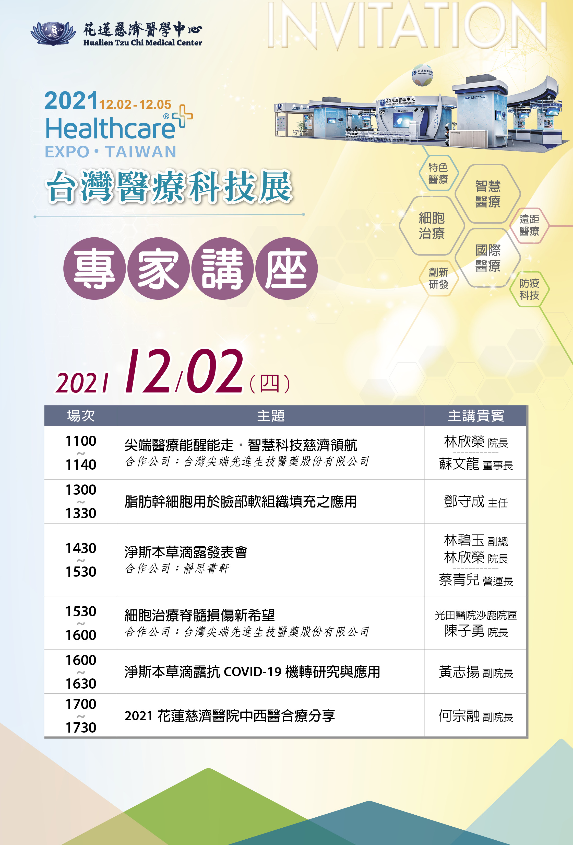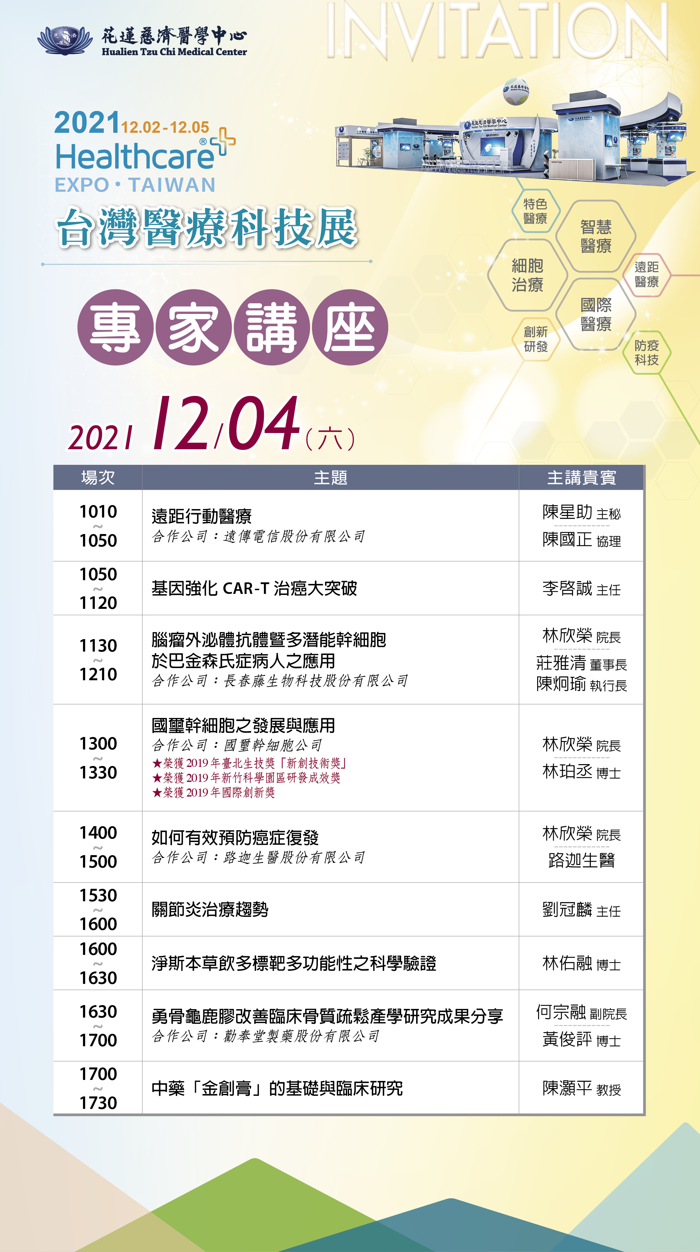 靜思書軒淨斯本草系列產品也將聯合展出,2日下午,還有新產品發表會。連續四天二十六場專家講座內容涵蓋七大展題,包括素食者關心的蛋白質營養,以及熱門的關節炎治療新趨勢、如何有效預防癌症復發、運用外骨骼機器人作上下肢復健訓練計畫、脂肪幹細胞在臉部及軟組織填充之應用、基因強化CAR-T治療大突破、醫療AI、智慧遠距診療服務、以及花蓮慈濟醫院「能醒能走」特色醫療系列,結合智慧科技、再生醫學等中西醫復健合療等臨床經驗分享。
