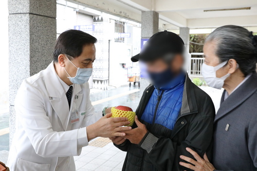 中圖:林欣榮院長贈送蘋果,祝福街友能平安過好年。