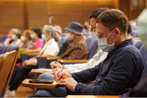 圖說:蔡昇宗主任致贈每位前來講座的民眾二月號的慈濟醫療人文月刊《人醫心傳》,封面故事就是脊髓晶片電刺激術助行的成果。