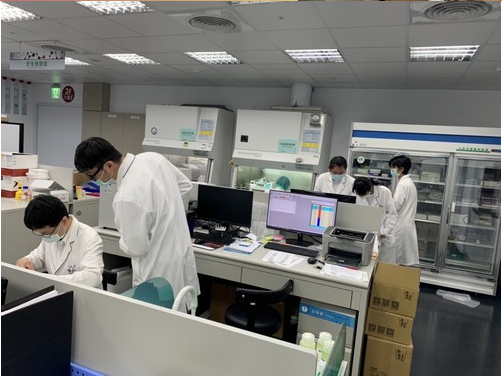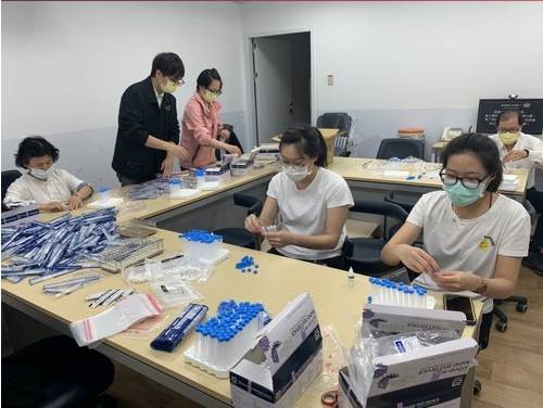 圖:檢驗科團隊加班將抗原快篩試劑分裝成小包送至感控室。
