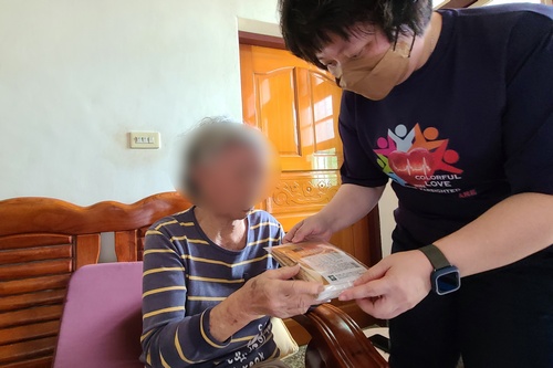 左圖:社服室主任謝侑書(右)與團隊往診時,帶上酸痛貼布來跟阿嬤結緣,緩解阿嬤肌肉酸痛的不適。