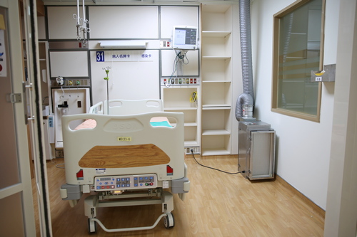 「病房每床都特別配置負壓設備」護理部督導李彥錚指出,這兩年Covid-19在全球延燒,臺灣疫情也在近期逐漸升溫,所以病房在設計時,每個病床為獨立空間,並且配置拉門及負壓設備,可因應疫情需求,隨時轉型為照護重症新冠肺炎個案的「微負壓隔離病房」。
