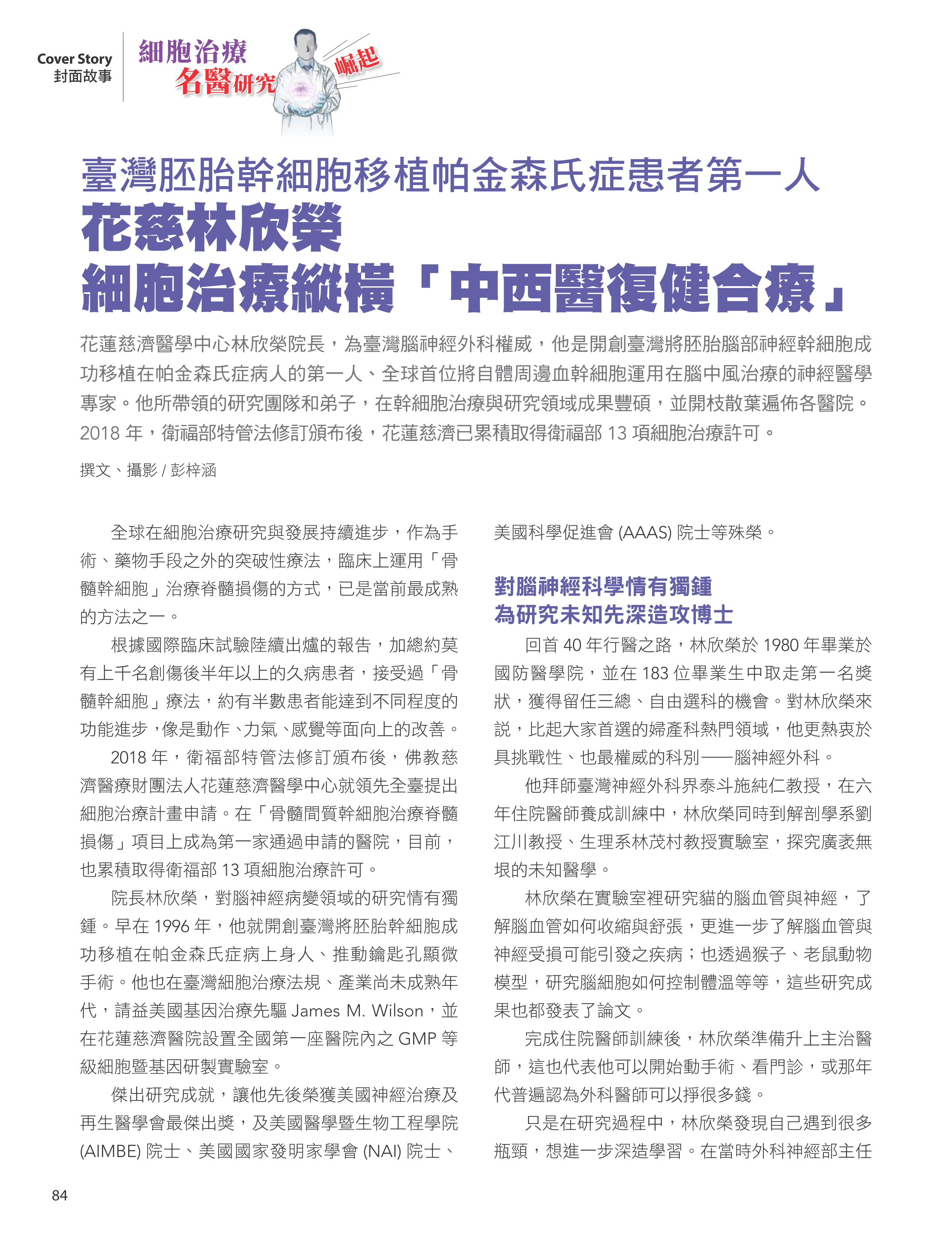 花蓮慈濟醫學中心林欣榮院長,為台灣腦神經外科權威,他是開創台灣將胚胎腦部神經幹細胞成功移植在帕金森氏症病人第一人、全球首位將自體周邊血幹細胞運用在腦中風治療的神經醫學專家。林欣榮院長帶領的研究團隊和弟子,在幹細胞治療與研究領域成果豐碩,並開枝散葉遍布各醫院。2018年,衛福部特管法修訂頒布後,花蓮慈濟醫院已累積取得衛福部13項細胞治療許可。