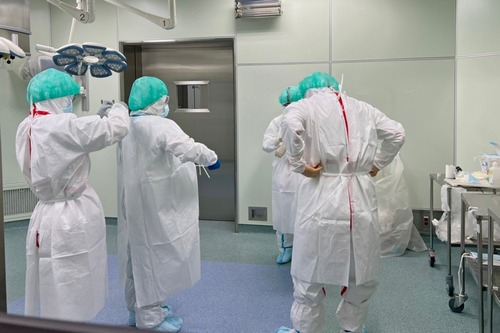 隨著確診人數越多,需要緊急手術的病患也日益增加,甚至在五月二十四日下午,花蓮慈院同時進行兩台確診者手術,分別是一位意外頭部外傷、一位意外傷到腰部,下半身無力的傷患。面對感染高風險的壓力,開刀房主任姚定國分享,落實所有防護步驟就是最好的辦法,只要是進入開刀房的人員,都最少需身著N95口罩和綁帶式口罩、P2防護衣和防水隔離衣、布織手術帽和紙帽、長筒鞋套和一般鞋套、雙層手套、護目鏡,全身從頭到腳都至少有兩層以上的保護,手術過程中遵循防護規定,手術結束後也嚴謹遵守感控SOP的穿脫和清消流程,最大目的就是保護病人,也保護整個醫療團隊的健康安全。