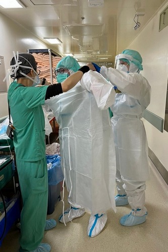 右圖:進入開刀房的人員最少需身著N95口罩和綁帶式口罩、P2防護衣和防水隔離衣、布織手術帽和紙帽、長筒鞋套和一般鞋套、雙層手套、護目鏡,全身從頭到腳有兩層以上的保護。