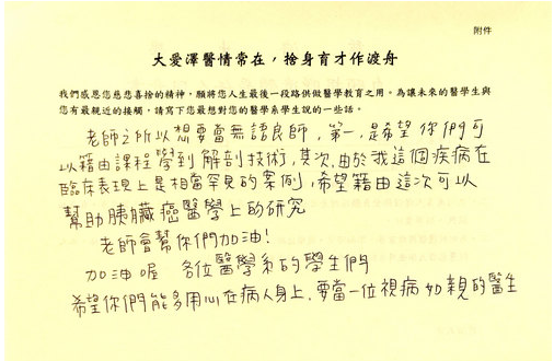 右圖:許永祥簽署「病理解剖」大體捐贈同意書,以身施教、化無用為大用,鼓勵學生要多用心,成為視病猶親的醫師。