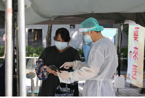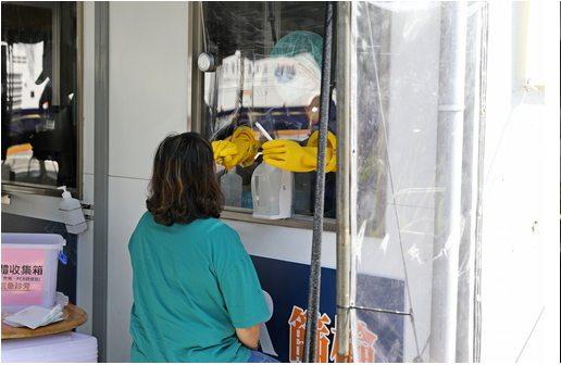 左圖:護理師為民眾做PCR採檢。透過一站式設計,包括醫師看診、護理師採檢、藥師給藥,都能夠一次完成。