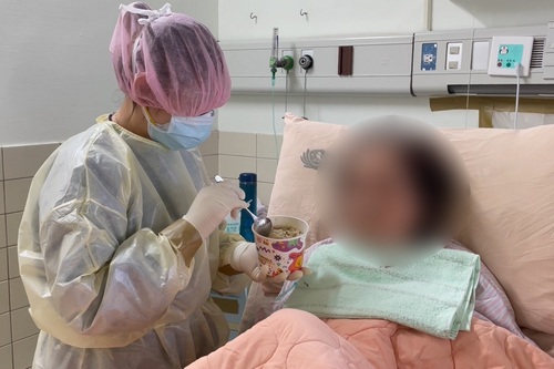 右圖:照護輔佐員協助護理師,做餵食、翻身、更衣、身體清潔等照顧工作,護理佐理員趙苡蘋(左)在專責病房裡餵確診者吃飯