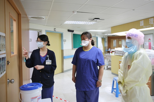 圖說:花蓮慈濟醫院二五東專責病房護理長周云鵑,對招募到的照護輔佐員做行前訓練、防護衣穿脫等注意事項及叮嚀。