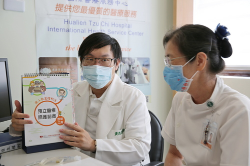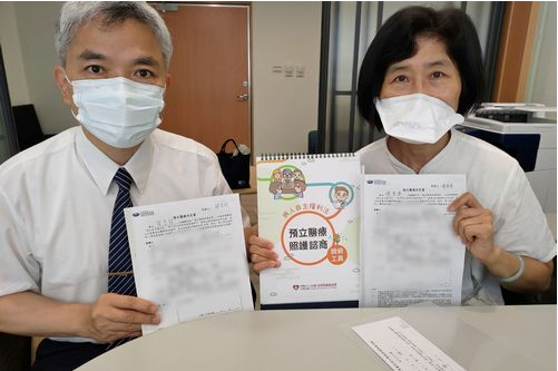 圖說:家庭醫學科醫師黃亮凱(左)說,希望藉由在事故發生之前,所有的醫療決策都是由病人事先做決定,對家人來說,能夠理解病人的選擇,也能凝聚家族的共識,並且醫療團隊也能按照病人意願去做醫療處置。