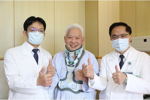 圖:不再為頸椎壓迫而苦,陳先生(中)開心的讚嘆洪祥益主任(左)的微創術式精湛。右為林欣榮院長。