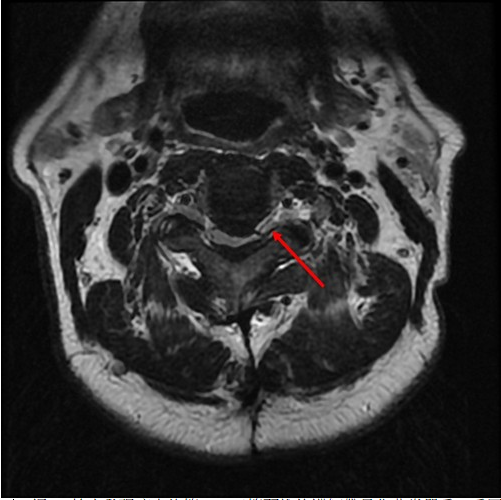 圖:經MRI檢查發現病人的第二、三節頸椎後縱韌帶骨化非常嚴重,受壓迫的神經幾乎扁成一條線。