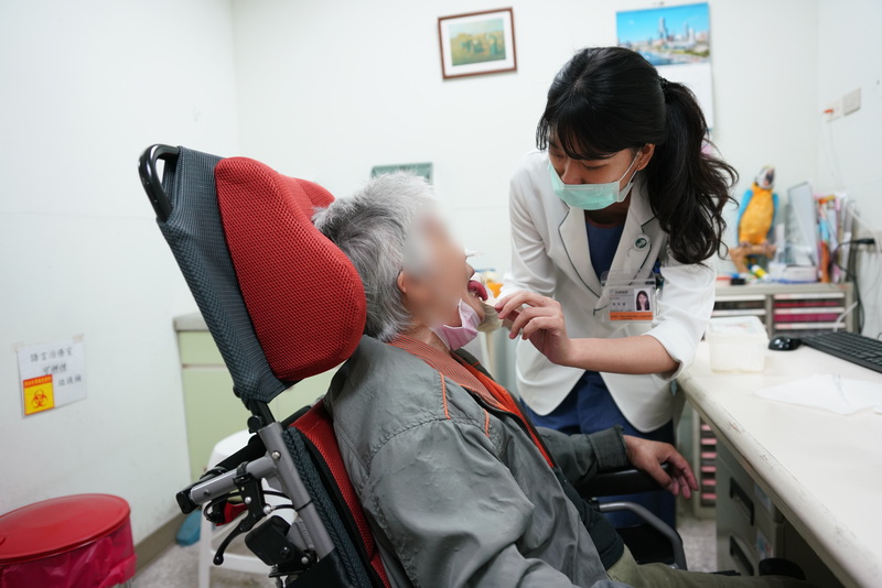 圖說(左):語言治療師林佳瑜利用壓舌板引導病人做舌頭抗阻力運動,訓練其舌頭上抬之肌肉力量。