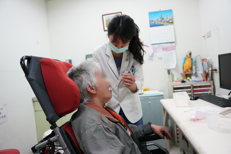 圖說(右):語言治療師林佳瑜藉由控制經口的水量,讓病人可以安全的由口喝水。