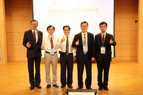 左起台灣耳鼻喉科醫學會前理事長蕭安穗、監察院監察委員蕭自佑、花蓮慈院林欣榮院長、台灣耳鼻喉科醫學會理事長陳穆寬、花蓮慈院副院長陳培榕。