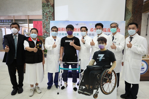 左圖:花蓮慈濟醫院與尖端醫合作自體骨髓間質幹細胞治療脊髓損傷申請計畫的第一例簡先生,也是臺灣第一位脊髓損傷超過五年,經細胞治療後還能重新站起的病友,在8月9日分享他的「輪生逆轉勝」。