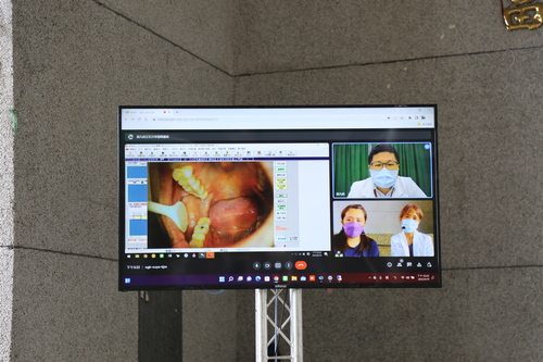 圖說:秀林鄉衛生所田惠文主任(前排中)透過五官鏡的檢查,讓位於花蓮慈院的耳鼻喉科陳柏呈醫師(螢幕影像),就可以即時清楚看到民眾咽喉檢查影像,進一步進行看診與開藥的處置。