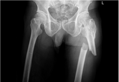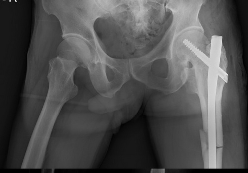 左圖:邱伯伯左側股骨骨折(大腿骨折),經過花蓮慈濟醫院麻醉團隊進行術前神經阻斷術、以及骨科團隊骨折固定手術(右圖)後,邱伯伯手術沒有了疼痛問題。