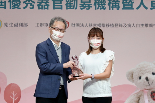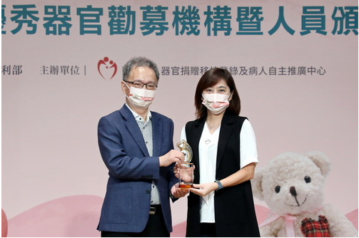 圖說:衛生福利部9月28日舉辦「第十四、十五屆優秀器官勸募人員暨醫療機構」表揚大會,施明蕙器捐協調師獲得第十四屆優秀器官勸募人員,並與周桂君協調師雙雙獲得「器官捐贈精彩十年」等獎項。