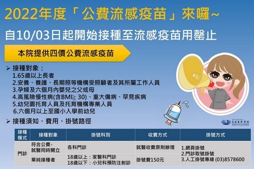 張菁育副主任表示,其他符合公費接種的民眾則是分流到家庭醫學科門診,或者直接在原本就診科別的診間施打;若是單純接種的民眾,18歲以上至家醫科門診,18歲以下至小兒科預防注射門診,可由人工掛號專線03-8578600或上花蓮慈院網頁掛號、門診取號機掛號來接種流感疫苗。