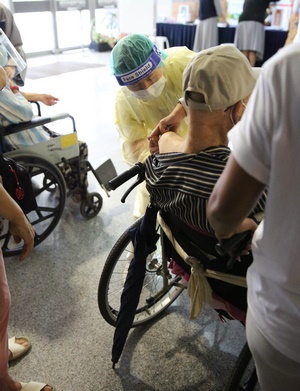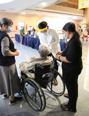 圖說:花蓮慈院醫事室副主任張菁育說,行動不便坐輪椅前來的長者,則是貼心安排醫師、護理師到等候區為長輩問診及接種。