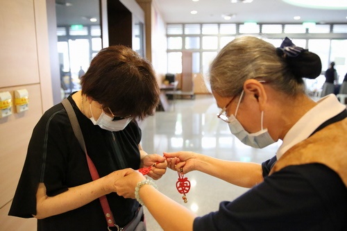 左圖:「重陽節快樂!」10月4日是重陽節,今日來接種的長輩都會收到一份結緣品,是花蓮慈院特別為這些長者準備的喜氣平安吊飾,祝福他們都能平安健康。