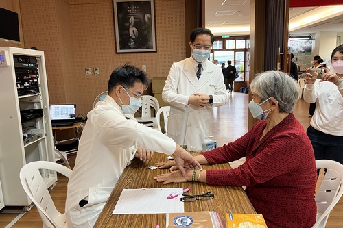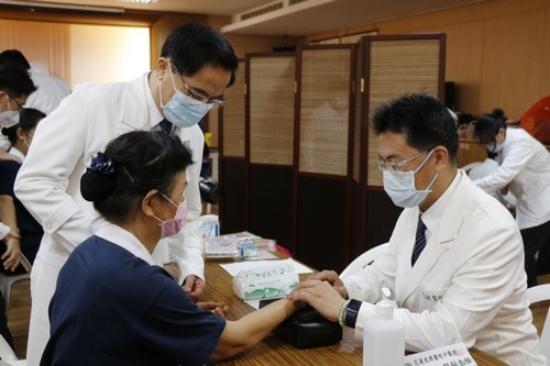 右圖:何宗融副院長(右一)一邊問診治療,林欣榮院長發揮關懷志工的「心靈」治療,師姊覺得很歡喜。(張汶毓攝)