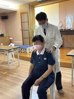 右圖:江國輝中醫師已推拿手法緩解志工連日來的不舒服症狀。(蔡椀婷攝)