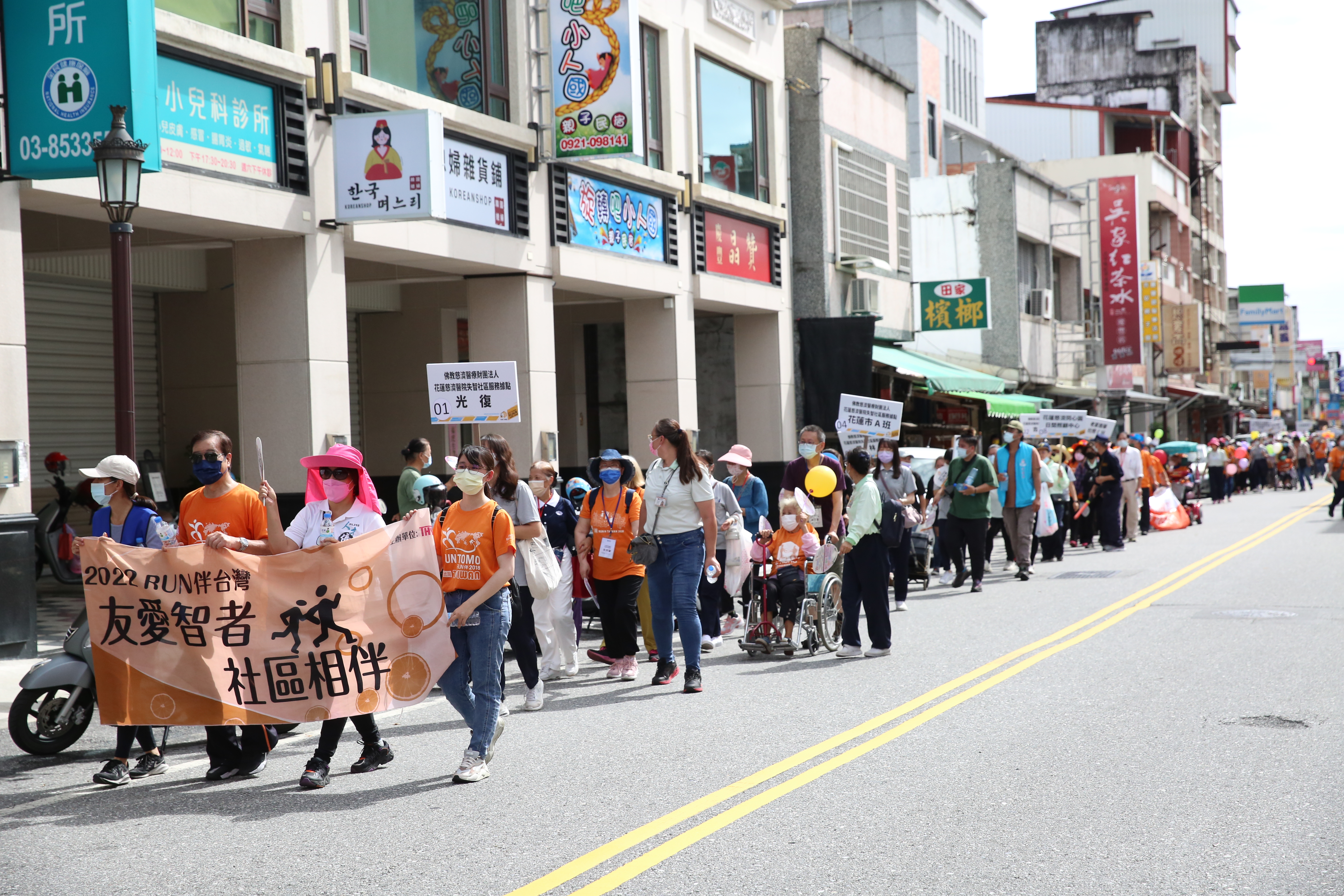 圖:2022RUN伴台灣「友愛智者.社區相伴」活動21日上午,三百多位長者在志工陪伴下,四百多人一路從吉安鄉中央路、中山路口廣場出發,沿著中山路走到好客藝術村。(游繡華攝)