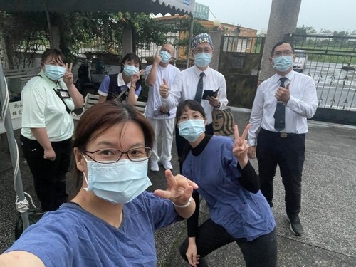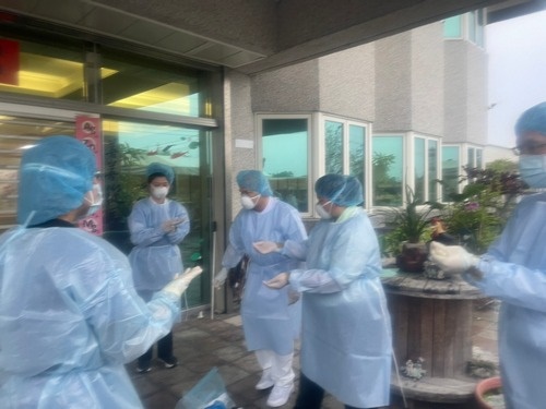 圖說:感管室黃妙慧主任(藍色工作服)、江惠莉組長(藍色工作服)、內科部副主任王智賢(後排右二)、老年醫學科主任高聖倫(後排右一)與社區健康中心護理師去安養中心做篩檢。