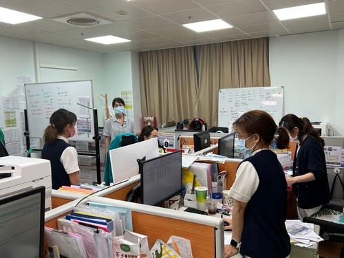 左圖:感管室主任黃妙慧醫師(左一)、感控護理師何翠華(左二)與急診室護理長陸家宜(右一)確認病床空間配置圖,右二為護理部副主任王琬詳。