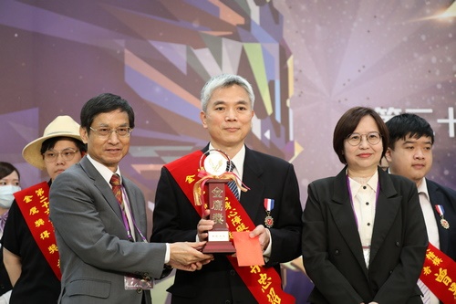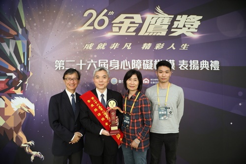 圖說:梁忠詔主任獲身心障礙楷模金鷹獎(右圖),花蓮慈院醫秘李毅(左圖左一)與梁忠詔主任的家人一起到現場祝福。(攝影/游濬紘)