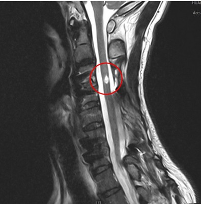 右圖:紅圈為邱先生頸椎脊髓損傷處。邱先生表示,透過電刺激器協助他站立時的穩定性,再搭配高強度的手腳肌力、平衡感、耐力復健,現在已經可以獨自一人自由行動,大大提升了生活品質與工作效率。
