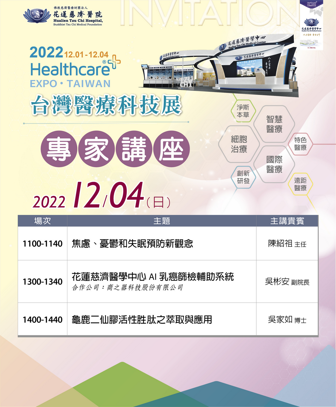 專家講座內容涵蓋七大展題,包括淨斯本草新品發表及研究成果、雲端落地打造無圍牆醫院、美味營養新蔬食健康新生活、尖端特色醫療(腦部手術機器人創新科技、神經幹細胞再生與晶片刺激治療、CAR-T治療)、黃金蟲草研究發表、中西醫合療創新與系列研究成果、臨床細胞治療新趨勢(腦中風、脊髓損傷、再生運動醫學、美容醫學、特管法申請經驗分享等)、AI乳癌篩檢輔助、以資通訊科技驅動健保論人計酬制度、災難護理及緊急醫療、以及焦慮、憂鬱和失眠預防新觀念等經驗分享。