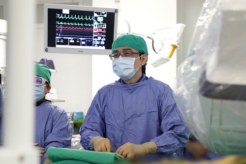 左圖:心臟外科張睿智主任在患者腿部動脈置放長管,並把金屬導絲穿進長管內。