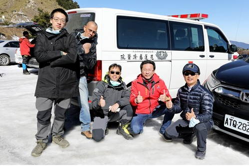 右圖:每年元旦假期到二月底,花蓮北區各院醫師輪值假日合歡山雪季醫療站,圖為2021年花蓮縣衛生局長朱家祥(右二)與花蓮慈院急診團隊上合歡山情景。