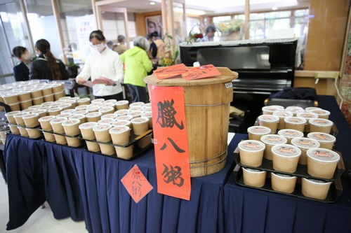 林欣榮院長表示,相傳釋迦牟尼修行時,曾餓倒在地,一位牧羊女送他一碗黏米煮成的粥;釋迦牟尼食後,於河中沐浴並靜坐菩提樹下沉思,於十二月八日悟道成佛。日後,佛教徒選在這天與眾人分享臘八粥,希望透過這節日啟發人人的愛心與善心,並且感恩、知足,也期待人與人之間有更多的善解與包容。