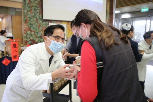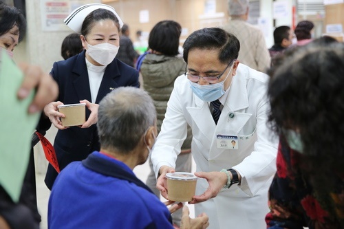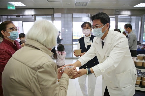 「祝福臘八節平安吉祥!」院長林欣榮、副院長吳彬安、何宗融及護理部主任鍾惠君三十日上午帶領醫護團隊,逐一將暖呼呼的臘八粥送到民眾的手中。陪伴先生來辦理出院的陳小姐說,甜甜的很好吃,料很多!在這樣的天氣裡收到臘八粥很感恩也很開心,並許下新年心願,希望先生能健健康康,闔家平安。