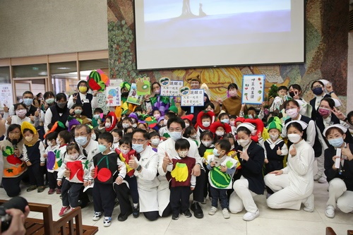 右圖:臘八節這天,大愛幼兒園的小朋友,穿戴蔬果衣服、帽子,帶來活潑的唱跳,讓病人及家屬都感受到孩子滿滿的健康活力。