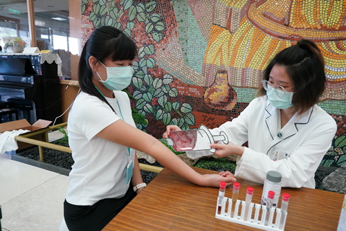 活動中,醫檢師莊尚芫、吳珮瑄負責介紹介紹二樓檢驗醫學科報到號碼機的使用方法,先點選抽血、心電圖、領取容器或輪椅抽血,接著掃條碼領號碼牌,同時也說明為何抽血後,醫檢師會叮嚀「不要揉、要按壓5分鐘」,主要是因為「揉」會影響凝血功能產生瘀青。