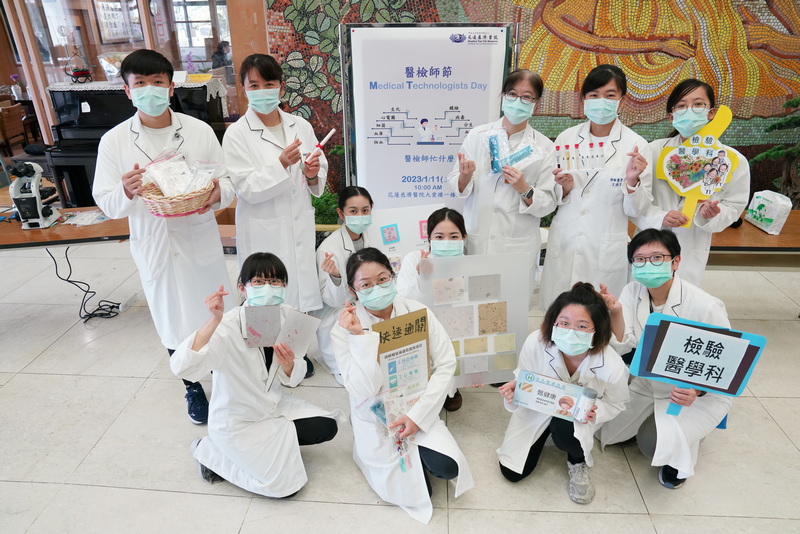 圖:慶祝醫檢師節,花蓮慈院檢驗學科團隊奮力使出渾身解數,讓民眾瞭解醫檢師的工作內容,日後更順利完成檢驗作業。